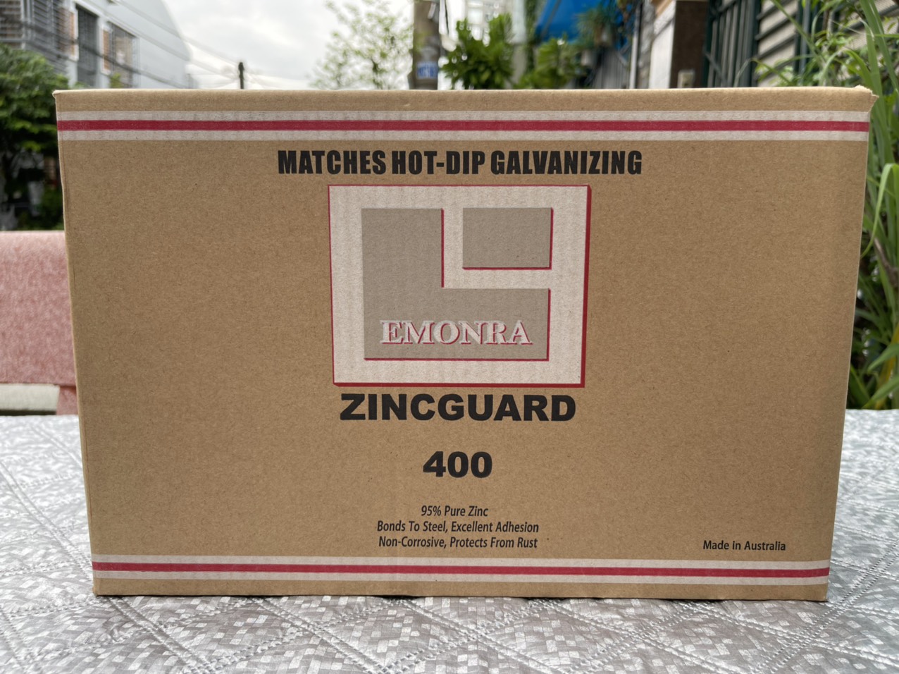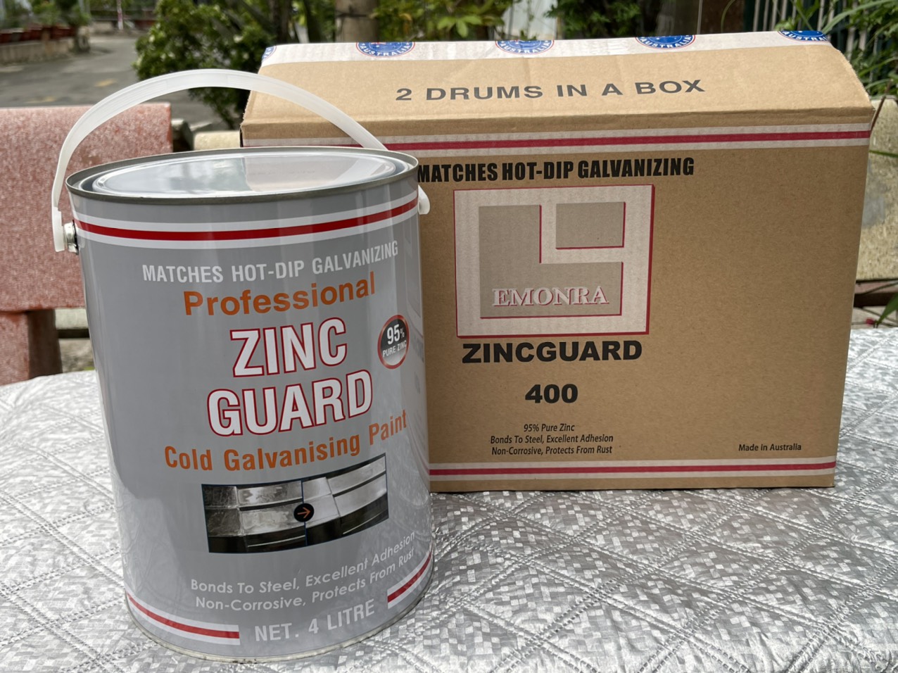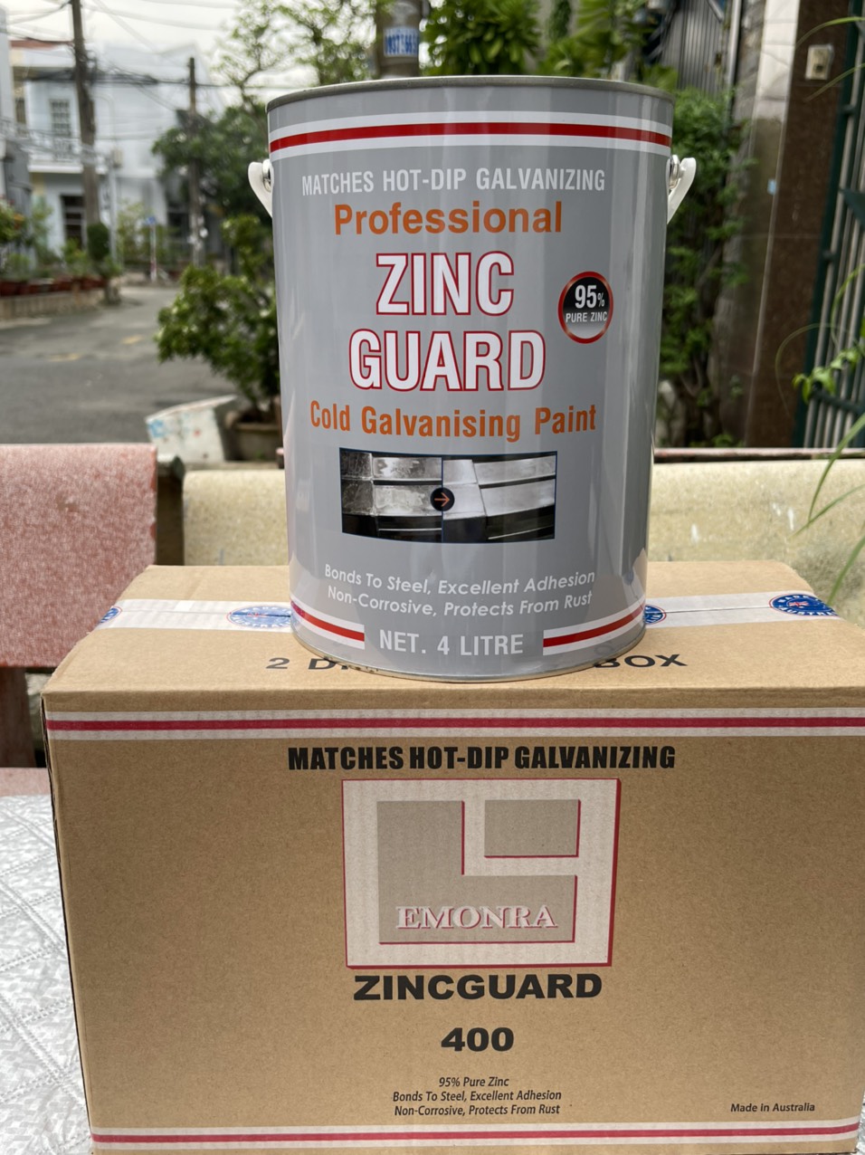 Sơn mạ kẽm lạnh ZG400 (Zinc Guard 400 4Lít) là sơn mạ kẽm lạnh màu kẽm sáng bóng (giống hoàn toàn mạ kẽm nhúng nóng) được đóng gói 1 lít, 4 lít và 18 lít, nhập khẩu trực tiếp từ Úc (EMONRA). Sản phẩm được chứng nhận Quartest 3 về hàm lượng kẽm sau khi khô đạt 95% (tiêu chuẩn ASTM) cung cấp chức năng chống ăn mòn điện hoá, đáp ứng điều kiện chống ăn mòn cao như nước biển và hoá chất. Ứng dụng rộng rãi trong việc sửa chữa lớp mạ kẽm (như hàn và cắt kim loại) theo tiêu chuẩn ASTM A780, chống rỉ sét, tái tạo bề mặt lớp mạ kẽm và sơn bề mặt đã mạ kẽm.
